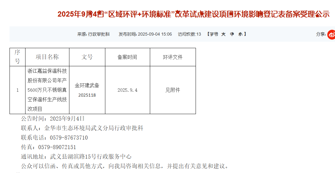 2025年9月4日,金华市生态环境局受理武义分局浙江嘉益保温科技股份有限公司年产5600万只不锈钢真空保温杯生产线技改项目环境影响评价报告表并对外进行公示。