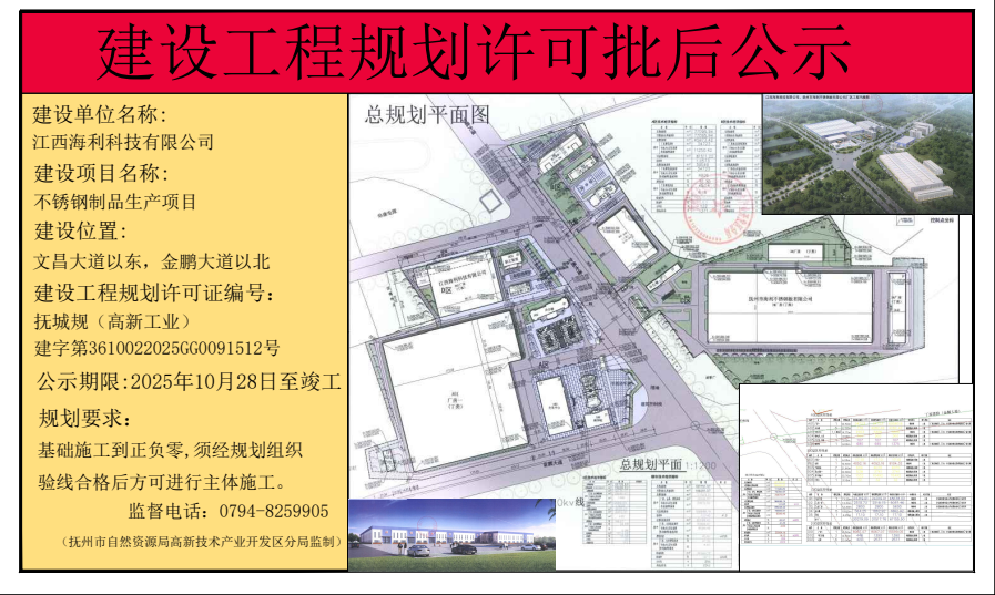 10月29日,江西海利科技有限公司不锈钢制品生产项目(B02仓库)建设工程规划获得许可批后公示。公示期限将至项目竣工。