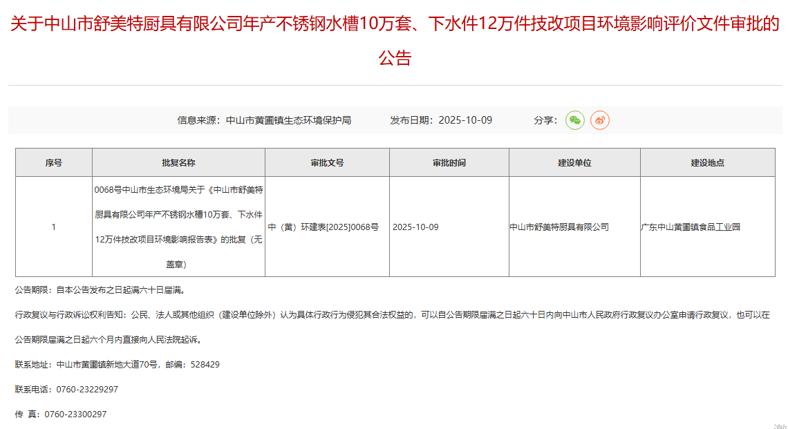 2025年10月9日,中山市黄圃镇生态环境保护局就中山市舒美特厨具有限公司年产不锈钢水槽10万套、下水件12万件技改项目环境影响评价文件作出审批意见并对外进行公告,公告期限:自本公告发布之日起满六十日届满。